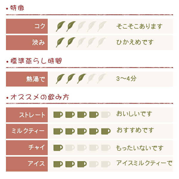 アッサム紅茶にしては軽めですのでミルクティーの場合はミルク少なめをおすすめします。